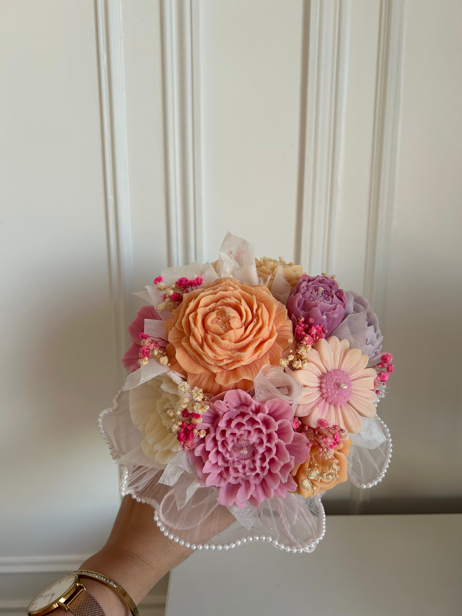 Découvrez Petit Cœur Fou, un somptueux bouquet de bougies sculptées en fleurs, mêlant des nuances délicates de blanc, rose, mauve et touches d'orangé, pour une ambiance féérique et poétique. Son parfum floral sucré enveloppe votre intérieur d’une atmosphère douce et chaleureuse, parfaite pour une touche de raffinement et de bien-être.